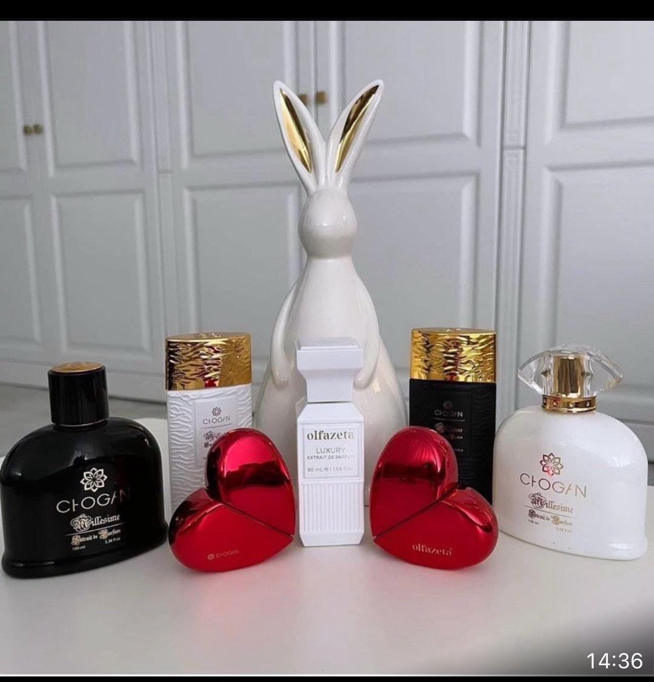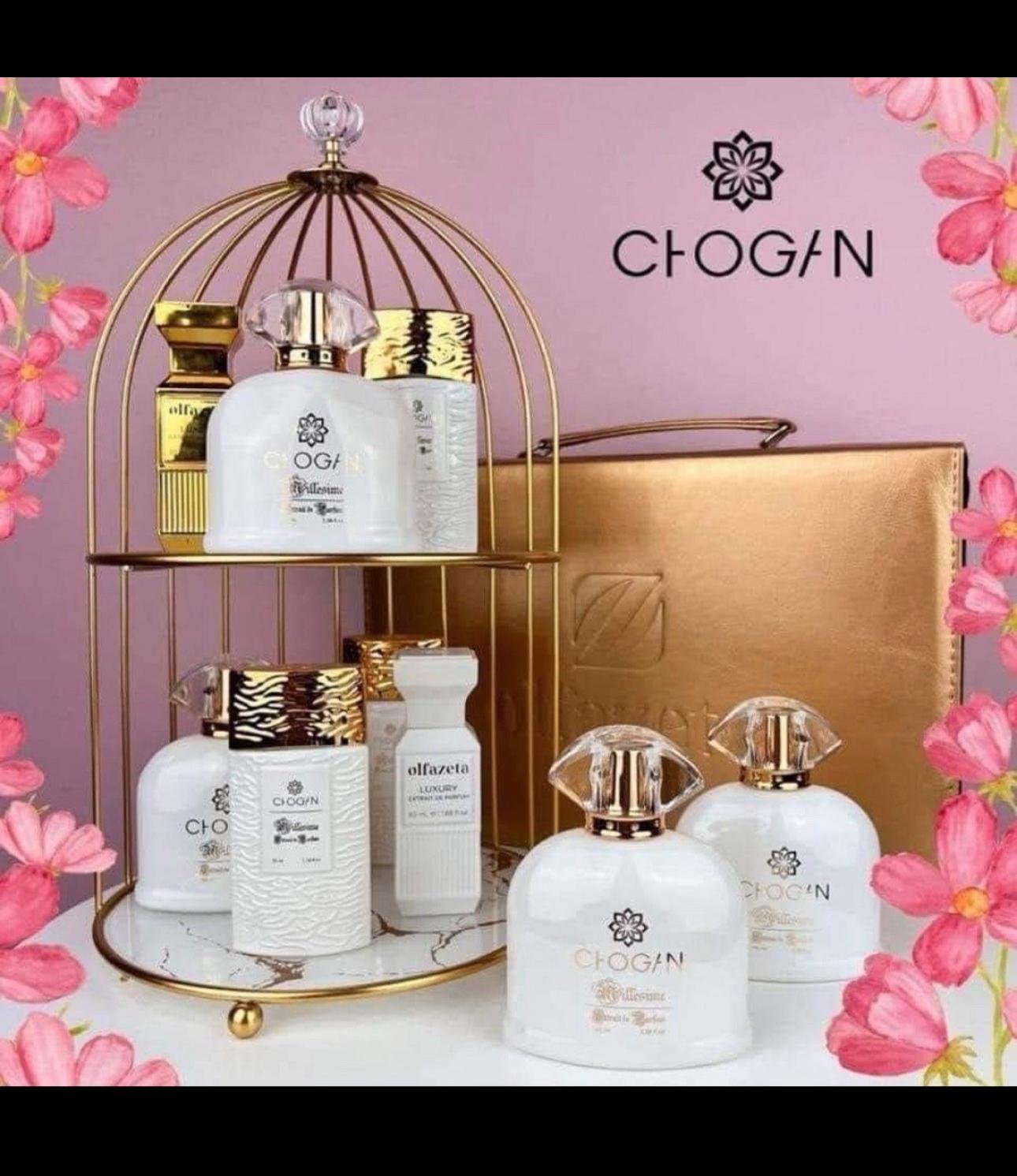 L’image met en avant une présentation soignée incluant un sac cadeau blanc siglé Chogan, un flacon aux tons rosés aux détails cristallins, ainsi que la collection Zeta, identifiable par ses emballages rose et noir, et ses flacons épurés blancs.